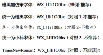 4、字体问题 涉及微信号的协查事项优先使用微软雅黑字体,载明微信号,以便区分微信号中的数字1与英文小写字母i、数字0和英文大写字母 O。若微信号中有英文大写字母 I, 则单独用仿宋字体(仿宋:I) 或宋体(宋体:I) 载明,以免和雅黑字体中的小写字母 I(l)混淆。如有下划线,请准确输入,勿使用短横线-替代。 样例和对照见下: